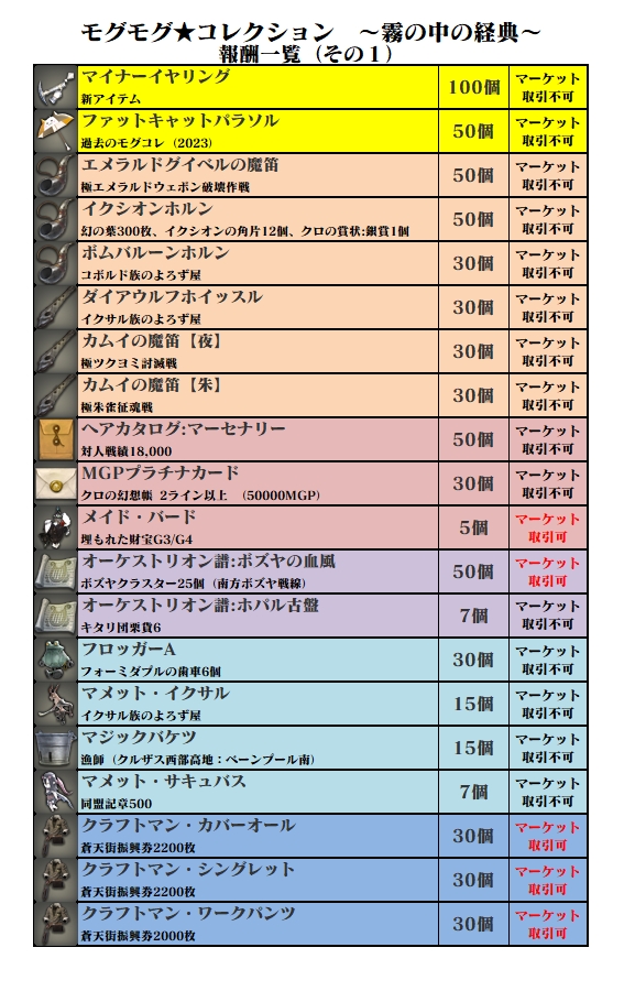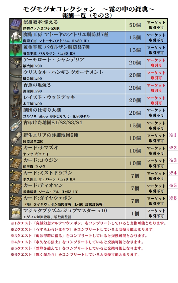 自分のねらい目は(これもいつもと同じですが)、新アイテムと過去のモグコレ、あとはマーケット取引不可の高難易度でドロップするアイテムです。なので、この6つを狙っていて、希少トームストーンを229個集める感じです。